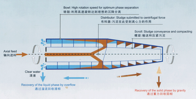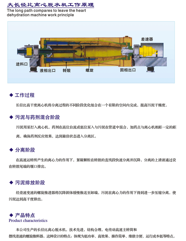 污泥離心脫水處理成套裝置(臥螺離心機(jī)),全稱:臥式螺旋卸料沉降離心機(jī),是城市生活污水處理、自來(lái)水生產(chǎn)過程中的污泥處理、工農(nóng)業(yè)污水處理工程中的重要設(shè)備。