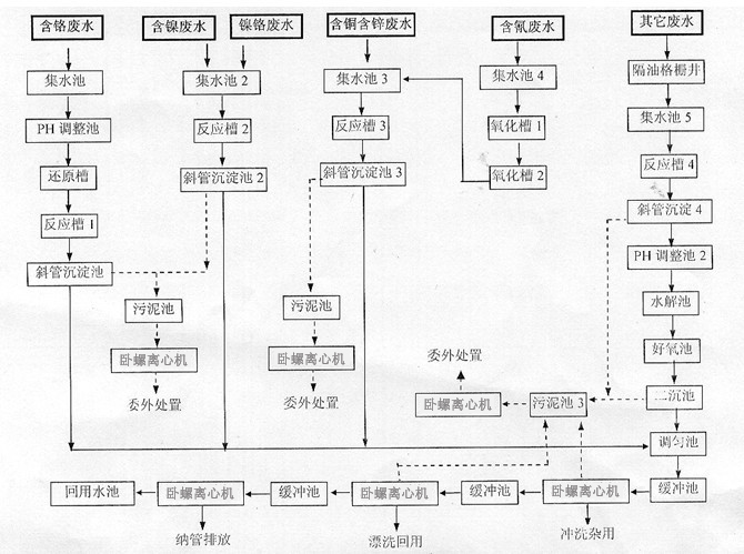 電鍍廢水治理工藝到現(xiàn)在已有很多成熟的工藝了,在廢水治理中為中國(guó)環(huán)保作出了很大的貢獻(xiàn)。常規(guī)的工藝是廢水分類(lèi)治理,如將含氰廢水、六價(jià)鉻廢水分開(kāi)預(yù)處理,將含氰廢水中的氰化物氧化、將六價(jià)鉻先還原成三價(jià)鉻,然后混合處理。這樣的好處在于有鐘對(duì)性地進(jìn)行處理,效果比較好,但由于廢水要分類(lèi),最終造成投資增加。在長(zhǎng)期和電鍍企業(yè)廢水治理單位的合作中,我們發(fā)現(xiàn)一個(gè)非常常見(jiàn)的問(wèn)題,就是廢水很難分清楚。在實(shí)際生產(chǎn)過(guò)程中,要把各類(lèi)廢水分得很清楚是非常困難的。往往是綜合廢水中各種成分的廢水都有,特別是化學(xué)鍍工藝廢水中有很多是絡(luò)合劑,和重金屬絡(luò)合后在水中非常穩(wěn)定。