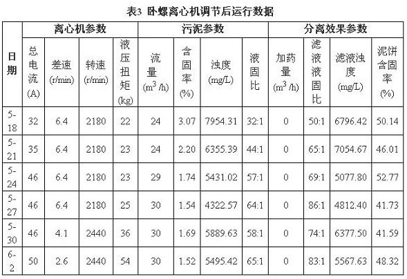 在參數(shù)的摸索調(diào)節(jié)中,轉(zhuǎn)鼓轉(zhuǎn)速過(guò)大會(huì)造成離心機(jī)本體的磨損和增加動(dòng)力消耗,轉(zhuǎn)速過(guò)小,達(dá)不到處理效果,在前期運(yùn)行轉(zhuǎn)速1800r/min的情況下,適當(dāng)調(diào)節(jié)到2100~2500r/min范圍內(nèi);同時(shí)結(jié)合污泥含固率的減少和物料的難分離特性,將差速由前期的8r/min降低到2.5~6r/min范圍內(nèi),延長(zhǎng)固體顆粒在離心機(jī)內(nèi)的停留時(shí)間。調(diào)節(jié)后運(yùn)行數(shù)據(jù)見(jiàn)表3(選擇上午8時(shí)數(shù)據(jù))。
