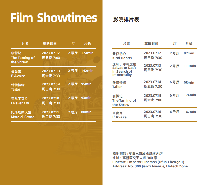 本次電影周選取的影片極具代表性。紀(jì)錄片《達(dá)利:不朽之旅》講述了西班牙超現(xiàn)實(shí)主義藝術(shù)家薩爾瓦多·達(dá)利的傳奇一生與傳世畫作;取材于英國杰出戲劇家莎士比亞最具“冒犯性”劇本的戲劇片《馴悍記》,在全片“笑果”不斷的同時,也用“以古現(xiàn)今”的方式引發(fā)觀眾對當(dāng)下的思考;取材于法國著名劇作家莫里哀代表作的戲劇片《吝嗇鬼》,生動描繪了世界文學(xué)史上“四大吝嗇鬼”之一“阿巴貢”的形象;精彩呈現(xiàn)意大利風(fēng)光的《托斯塔納天堂》將跟隨一群兒童冒險家漫游到意大利托斯塔納……