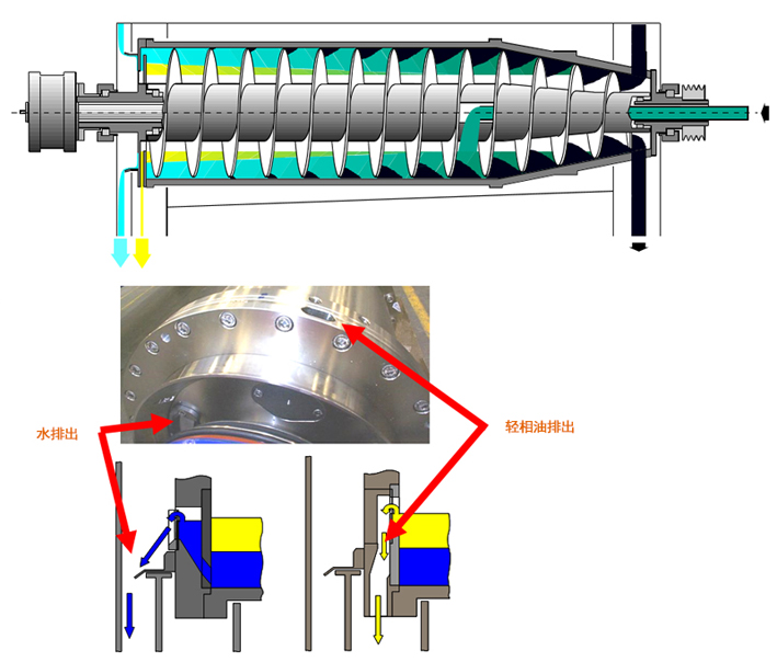 三相離心機(jī)結(jié)構(gòu)主要由差速器,螺旋,轉(zhuǎn)鼓、罩殼、機(jī)座、潤(rùn)滑系統(tǒng)、電機(jī)等部分組成。其工作原理是:懸浮液經(jīng)進(jìn)料管、螺旋出料口進(jìn)入轉(zhuǎn)鼓。在高速旋轉(zhuǎn)產(chǎn)生的離心力作用下,比重較大的固相顆粒沉積在轉(zhuǎn)鼓內(nèi)壁上,與轉(zhuǎn)鼓作相對(duì)運(yùn)動(dòng)的螺旋葉片不斷地將沉積在轉(zhuǎn)鼓內(nèi)壁上的固相顆粒刮下并推出排渣口,不同比重的液相會(huì)在轉(zhuǎn)鼓內(nèi)形成兩道液環(huán),經(jīng)大端蓋的兩個(gè)不同的出口流出。