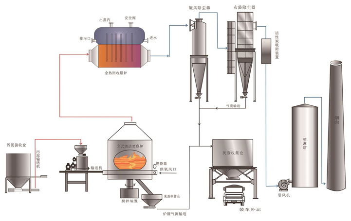 2.儲存?zhèn)}里的污泥通過輸送機(jī)均勻定量的將污泥送入立式清潔焚燒爐進(jìn)行焚燒處理,焚燒后形成的炭化物在燃燒過程中逐漸向立式清潔焚燒爐中心移動,徹底完成焚燒的灰渣經(jīng)由多孔管吹出的空氣得到冷卻,最終從處于中心部位的灰渣排出口排出;