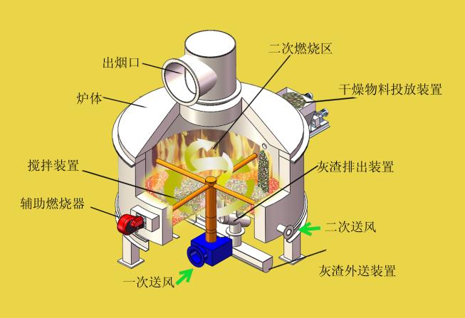立式清潔焚燒爐系統(tǒng)(從冷風(fēng)進(jìn)口到熱風(fēng)出口以及從濕料進(jìn)口到灰渣出口止):包括“進(jìn)料裝置,立式清潔焚燒爐,鼓風(fēng)機(jī),出渣系統(tǒng),輔助燃燒器,動力裝置”等組成;